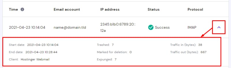 Você também pode ver mais informações sobre a sessão de e-mail como duração da sessão, cliente, tráfego e se alguma mensagem foi excluída clicando na seta para baixo que fica ao lado de cada entrada: