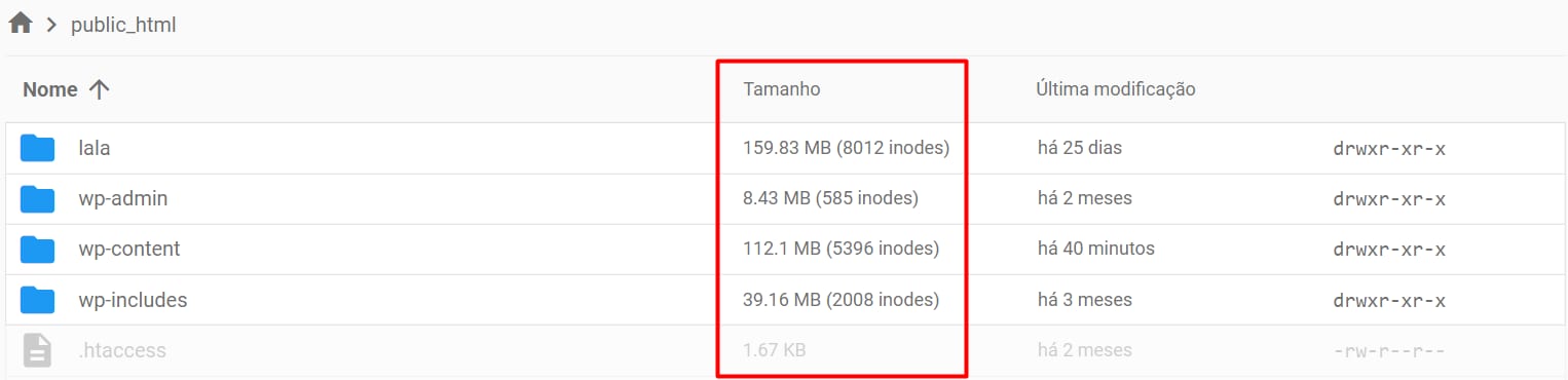 Após o cálculo ser concluído, você verá informações detalhadas sobre os tamanhos dos diretórios, bem como a contagem de inodes na coluna Tamanho: