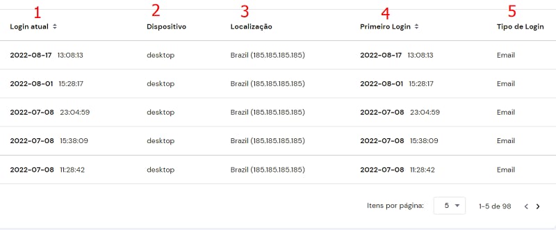 Nesta página, você pode ver informações detalhadas sobre os logins passados: