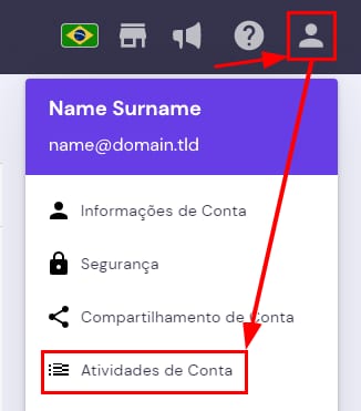 Se você quer conferir quem entrou na sua conta Hostinger, nós temos uma ferramenta só pra isso! Clique no ícone do perfil, e escolha Atividades de Conta:
