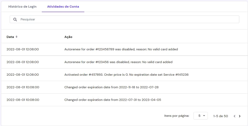 Nela, há duas seções: Histórico de Login e Atividades de Conta.
