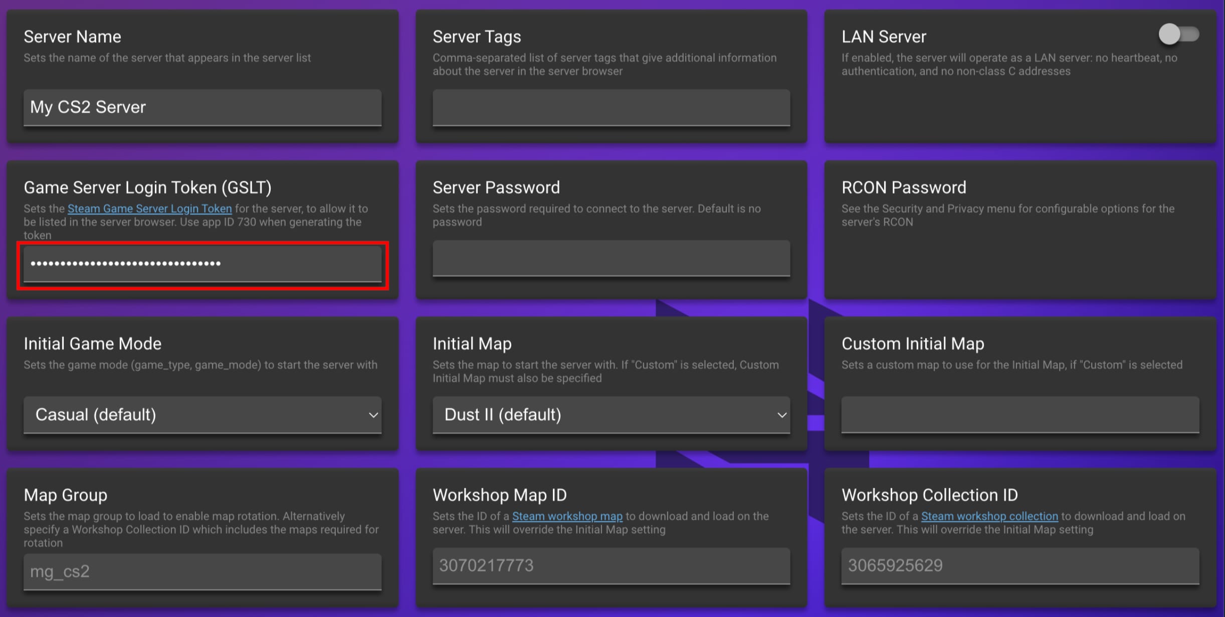 Para as opções de configuração do jogo, vá para Configuração → Configurações do Servidor CS2 e cole o GSLT (Game Server Login Token) gerado: