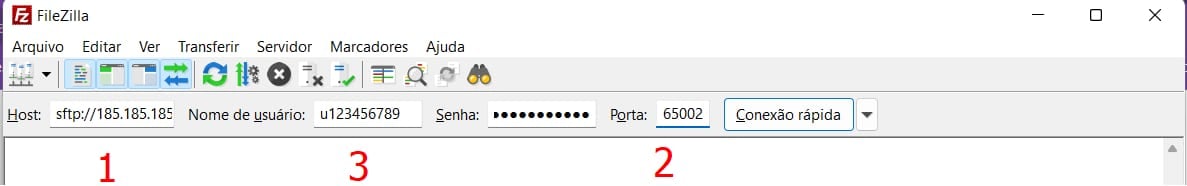 Abra o FileZilla e preencha a seção Conexão Rápida com a configuração obtida na seção Acesso SSH: