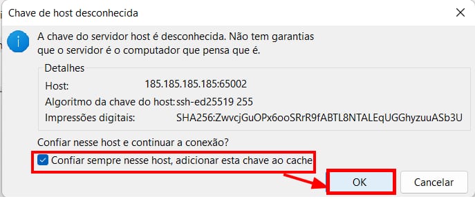 Caso você receba uma mensagem de chave de host Desconhecida, basta marcar “Confiar sempre neste host” e clicar em OK: