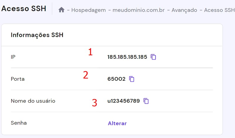 Use a configuração obtida na seção Acesso SSH: