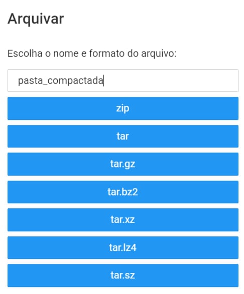 Os formatos disponíveis para criação de arquivo usando esse recurso são zip, tar, tar.gz, tar.bz2, tar.xz, tar.lz4 e tar.sz