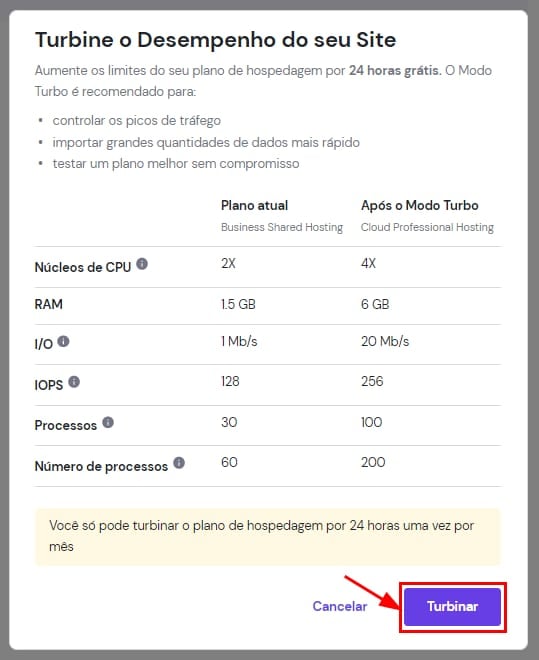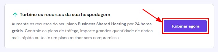 Para todos esses casos, apresentamos a você a opção Modo Turbo! Ao usá-la, você terá todos os recursos de um plano de hospedagem melhor por 24 horas, aumentando o desempenho para que você consiga realizar essas tarefas em menos tempo e reduzir a possibilidade de erros causados pelo limite excedido dos recursos do plano.