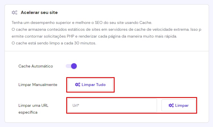 Para verificar uma alteração recente, limpe o cache da sua conta manualmente ou, se preferir, limpe uma URL específica, como mostra a imagem abaixo: