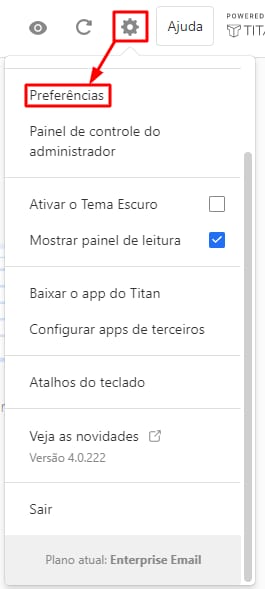 Se você se lembra de sua senha atual, poderá alterá-la em seu Webmail. Faça login na interface do seu Webmail, clique no ícone de engrenagem no canto superior direito e depois em Preferências: