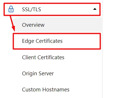 Faça login no seu painel Cloudflare e clique no domínio em questão. Em seguida, no menu à esquerda, escolha SSL/TLS → Edge Certificates :