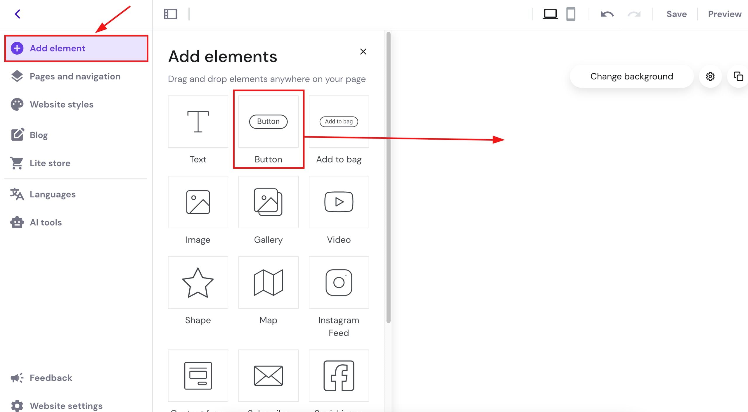 No editor, abra o painel Adicionar elementos à esquerda. Selecione o elemento do botão e arraste e solte-o em qualquer lugar do seu site: