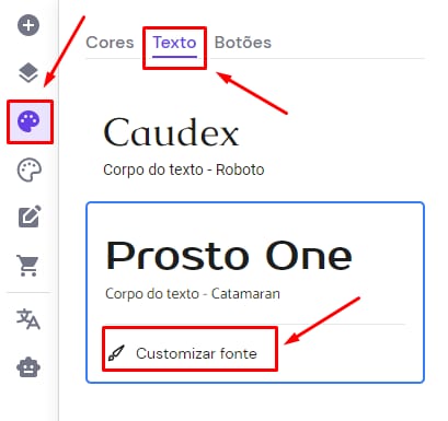 1. Vá até o menu lateral esquerdo e selecione Estilo do site. Clique na aba Texto e depois em Customizar fonte: