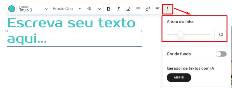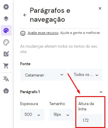3. Selecione a categoria de texto que deseja alterar (Título 1, Título 2, Links de navegação, Parágrafo 1, Parágrafo 2, etc) e mude a Altura da linha: