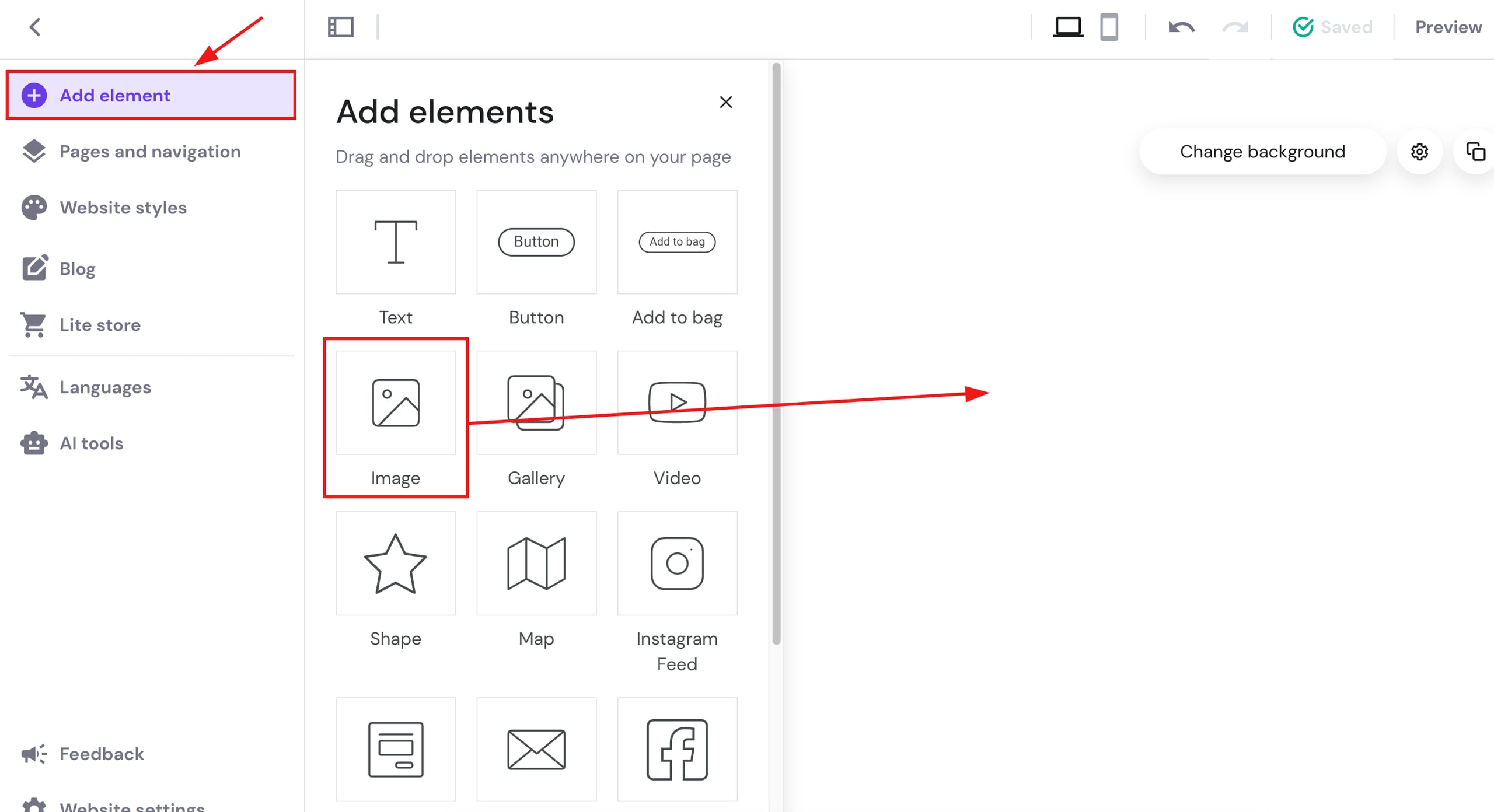 Para adicionar imagens ao seu site, abra o editor e expanda o painel Adicionar elementos à esquerda. Selecione o elemento de imagem e arraste e solte-o em qualquer lugar do seu site: