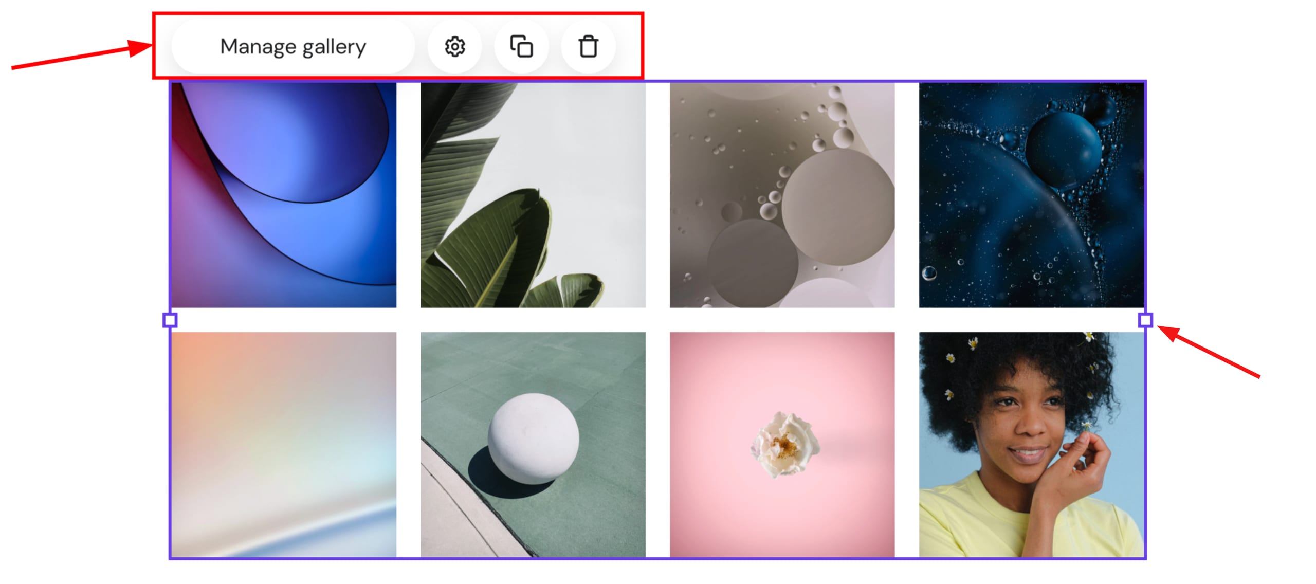 Clique no elemento para ver mais opções; você pode gerenciar as imagens da galeria, abrir as configurações, duplicar, excluir ou redimensionar o elemento: