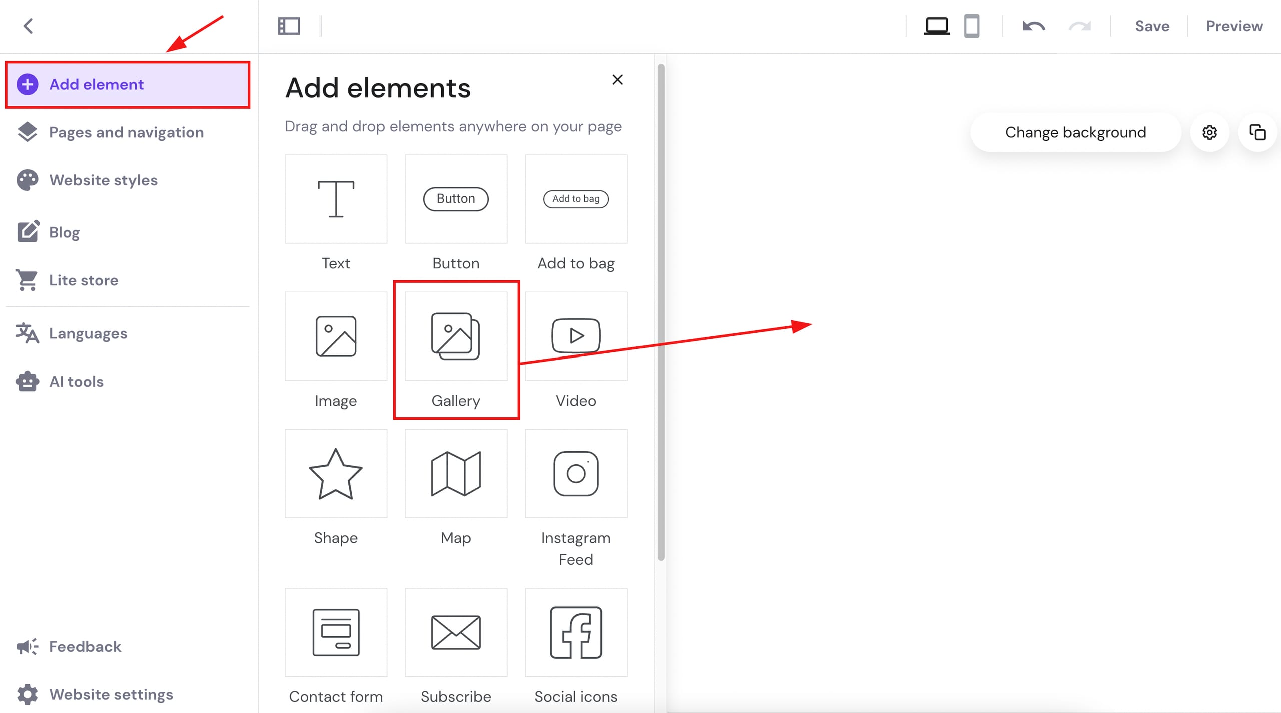 No construtor de sites, clique em Adicionar elementos, selecione a Galeria e arraste ela para a seção desejada em sua página: