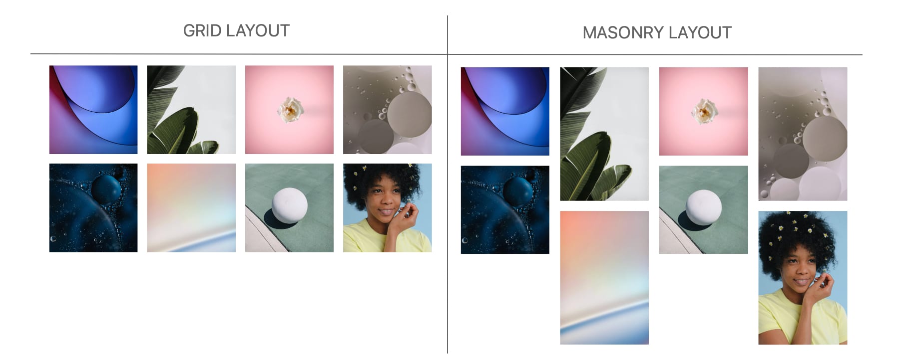 OBSERVAÇÃO: O layout da grade exibe imagens em quadrados específicos; o layout de alvenaria exibe imagens em suas proporções originais: