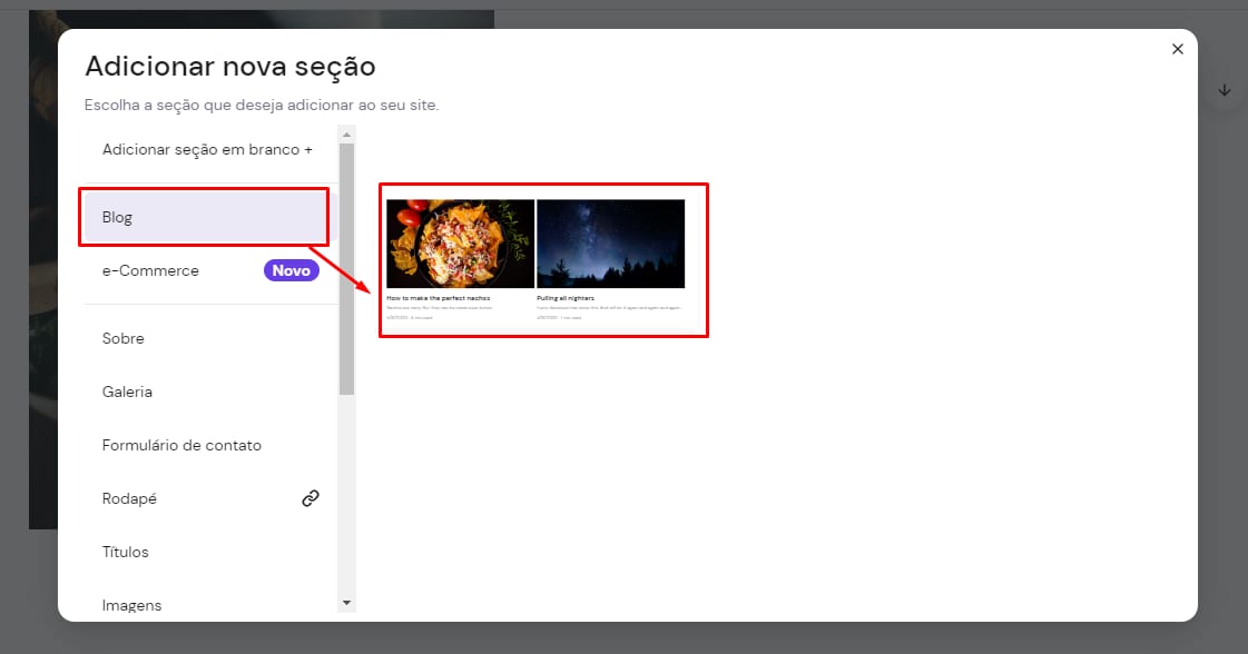Uma janela será aberta. No menu lateral, escolha Blog e clique na miniatura de exemplo, como mostrado na imagem abaixo. Uma seção de blog será adicionada à página.