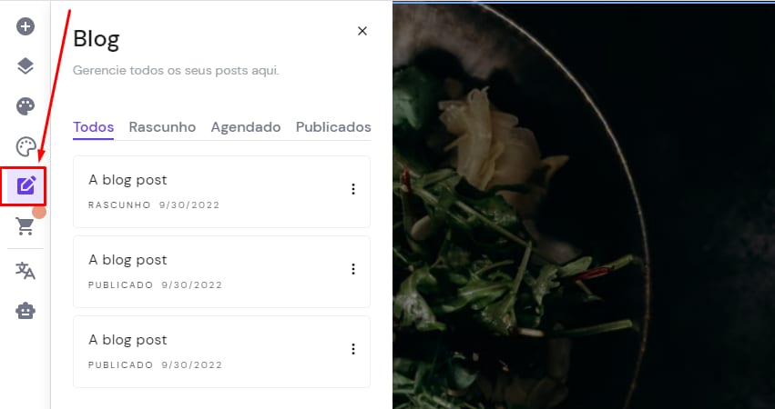 Para gerenciar as categorias de posts e quais postagens serão exibidas no site, vá até o menu que fica na lateral esquerda da tela e clique em Blog. Na aba que será aberta defina as preferências e configurações.