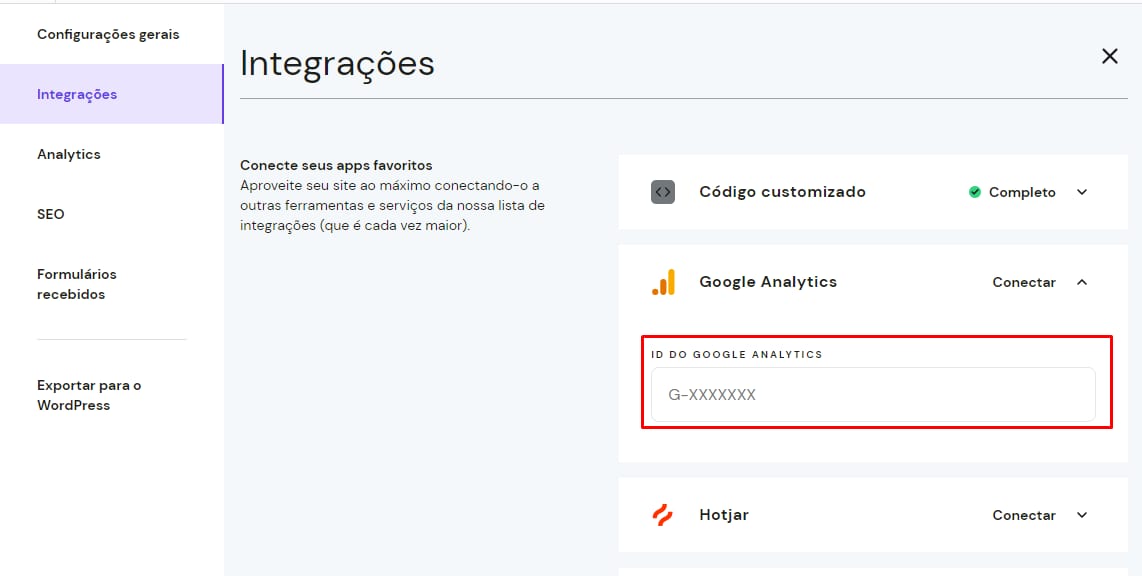 Dentro do Criador de Sites da Hostinger, abra as Configurações de integrações. Encontre o campo Google Analytics e cole a ID da métrica no campo ID do Google Analytics: