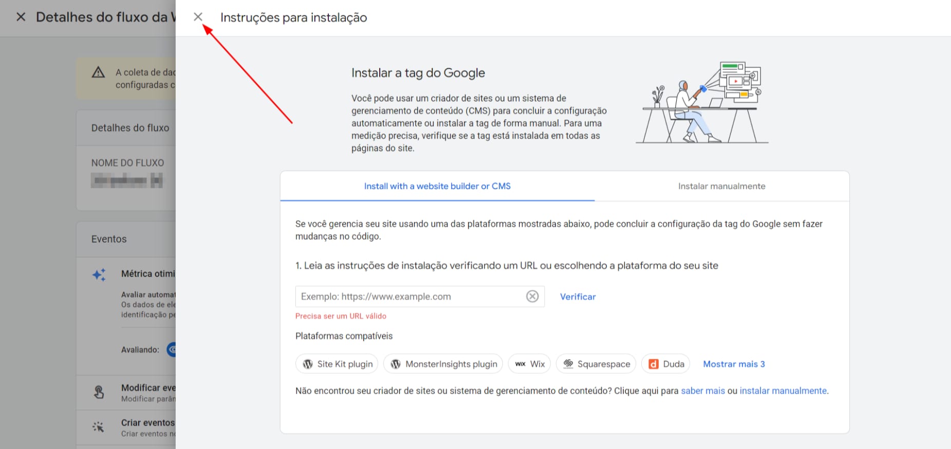 Vai aparecer uma janela pedindo para que você instale a tag do Google no seu site; simplesmente feche esta janela e encontre o seu ID da métrica – é tudo o que você precisa para conectar o Google Analytics ao seu site :
