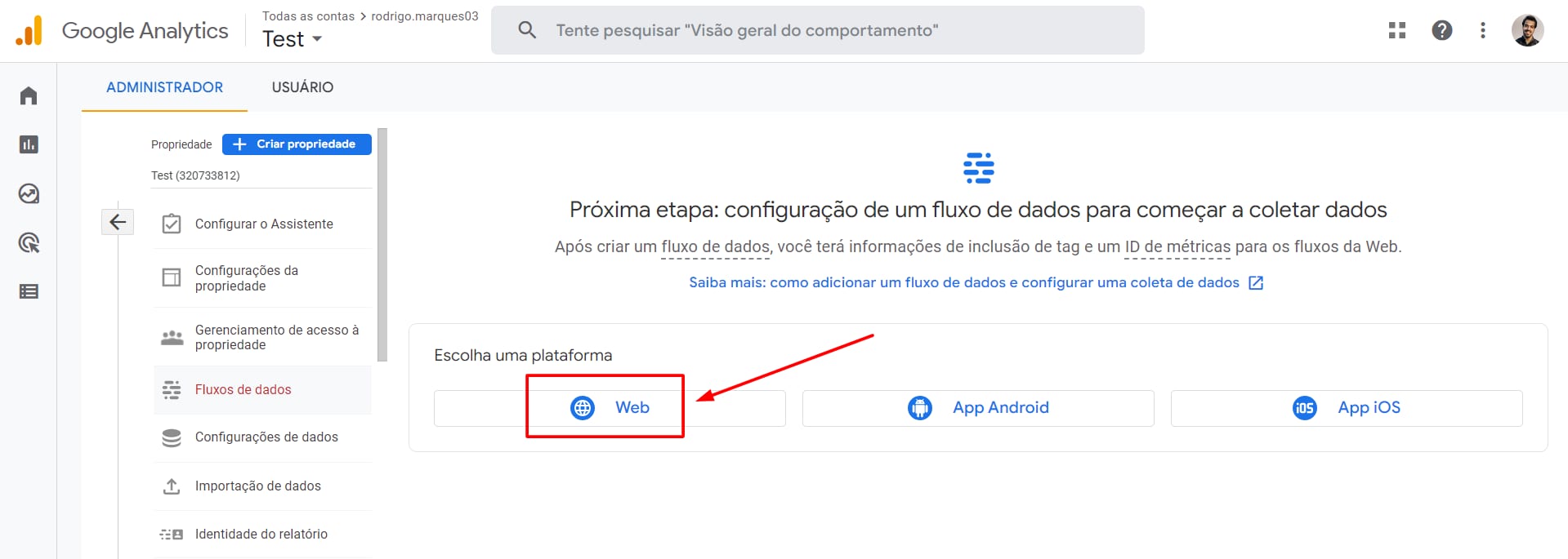 4. Indique que você deseja coletar dados em uma plataforma da Web:
