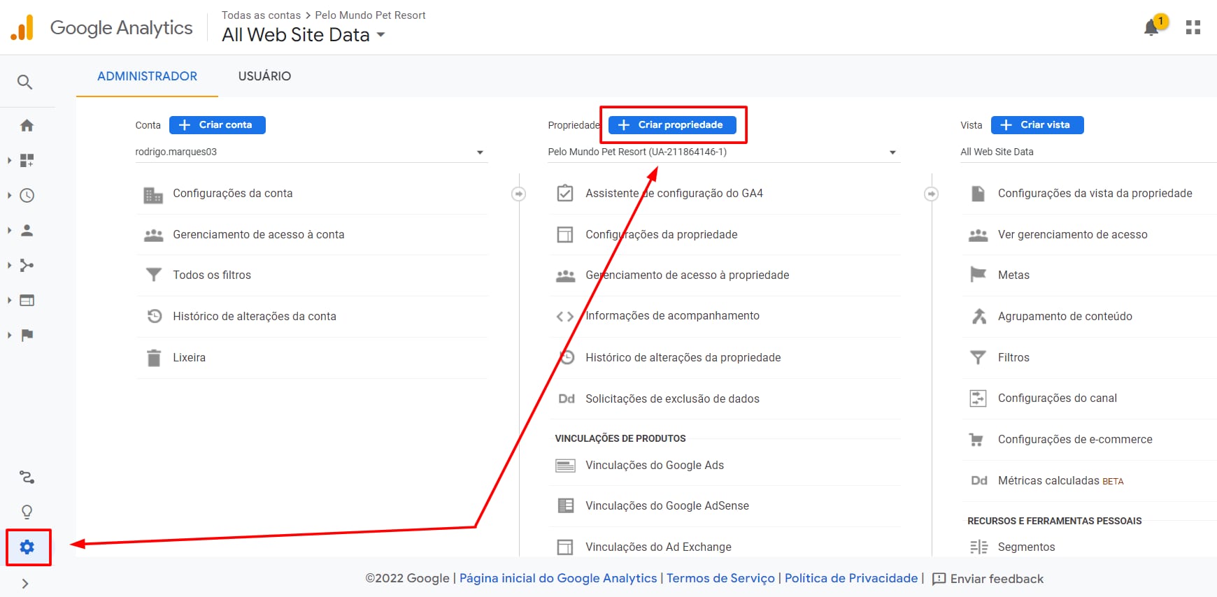 1. Na sua conta do Google Analytics, abra a seção Administrador no canto inferior esquerdo e clique em Criar propriedade: