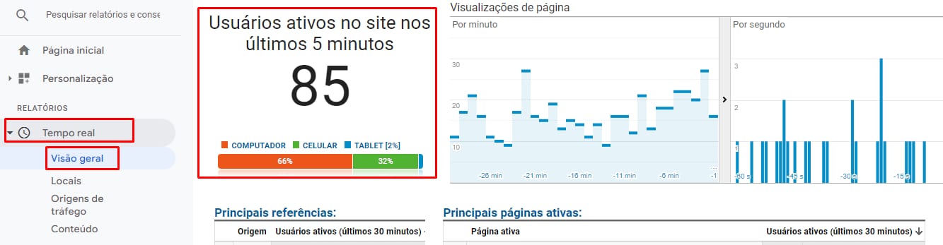 Mesmo assim, se você está ansioso para ver os relatórios sobre seu site, é possível ver esses dados em tempo real. Para fazer isso, abra seu site e, em outra guia, abra sua conta do Google Analytics. Vá para Tempo real → Visão geral.