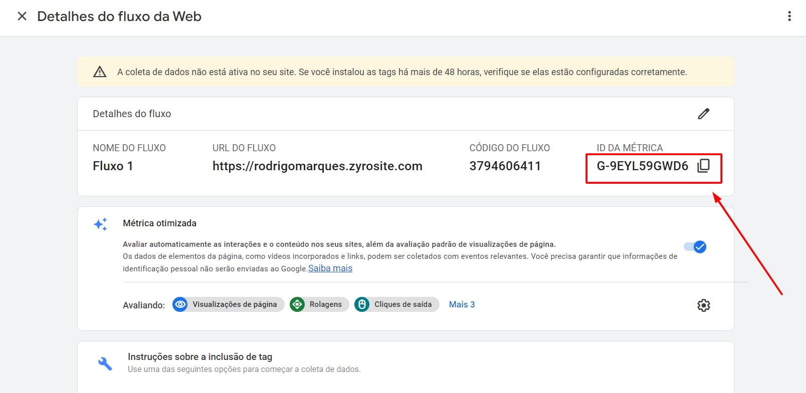 Para conectar o Google Analytics, você precisa saber a ID da métrica da sua propriedade do Google Analytics 4.