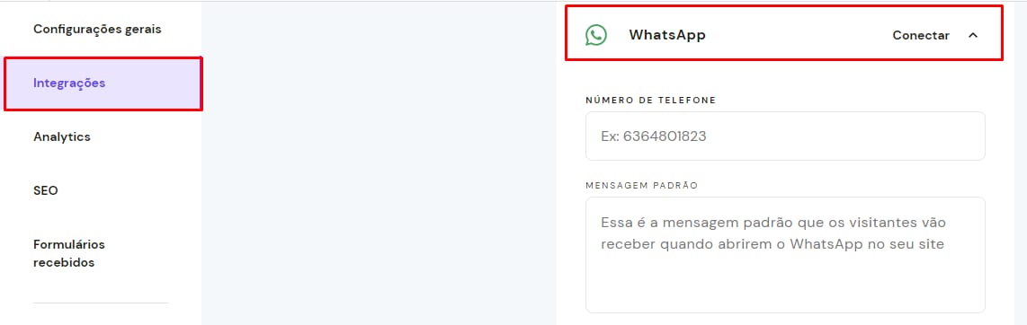 No seupainel de controle, abra as configurações de integrações e encontre o campo WhatsApp. Insira seu número de telefone e a mensagem padrão que os visitantes vão receber quando enviarem uma mensagem para você.