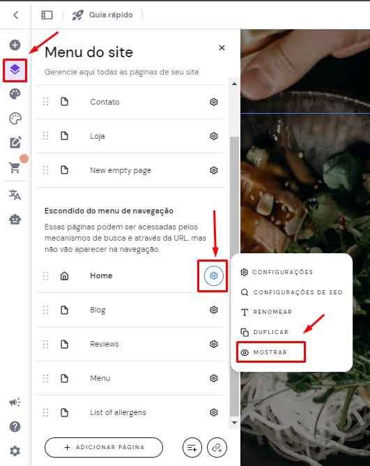 Para reverter a mudança e fazer com que a página volte a aparecer no menu navegação, clique no ícone de engrenagem e selecione Mostrar. Ou simplesmente arraste e solte o nome da página para seção Navegação principal: