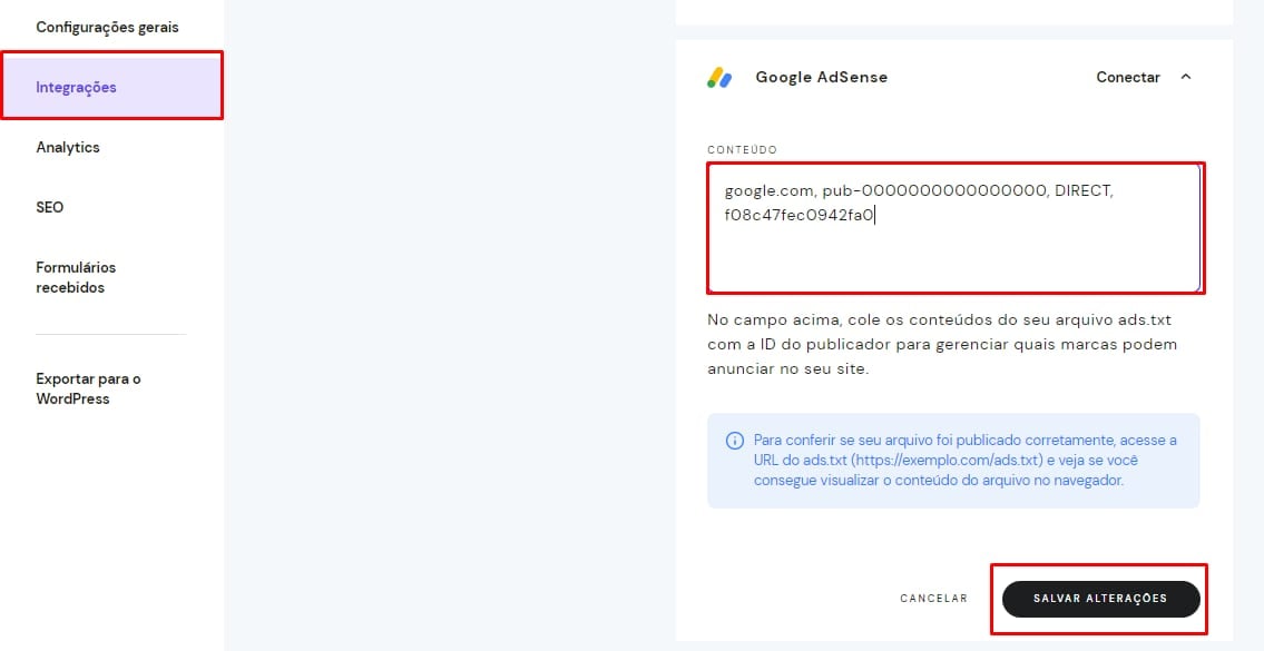 Com o arquivo ads.txt, vá para o Criador de Sites da Hostinger. Abra as configurações de integrações, encontre o campo Google AdSense e cole o código do arquivo ads.txt lá:
