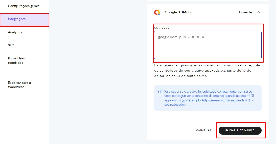 3. Depois, abra as configurações de integrações do seu site e encontre a seção Google AdMob. Cole o código lá: