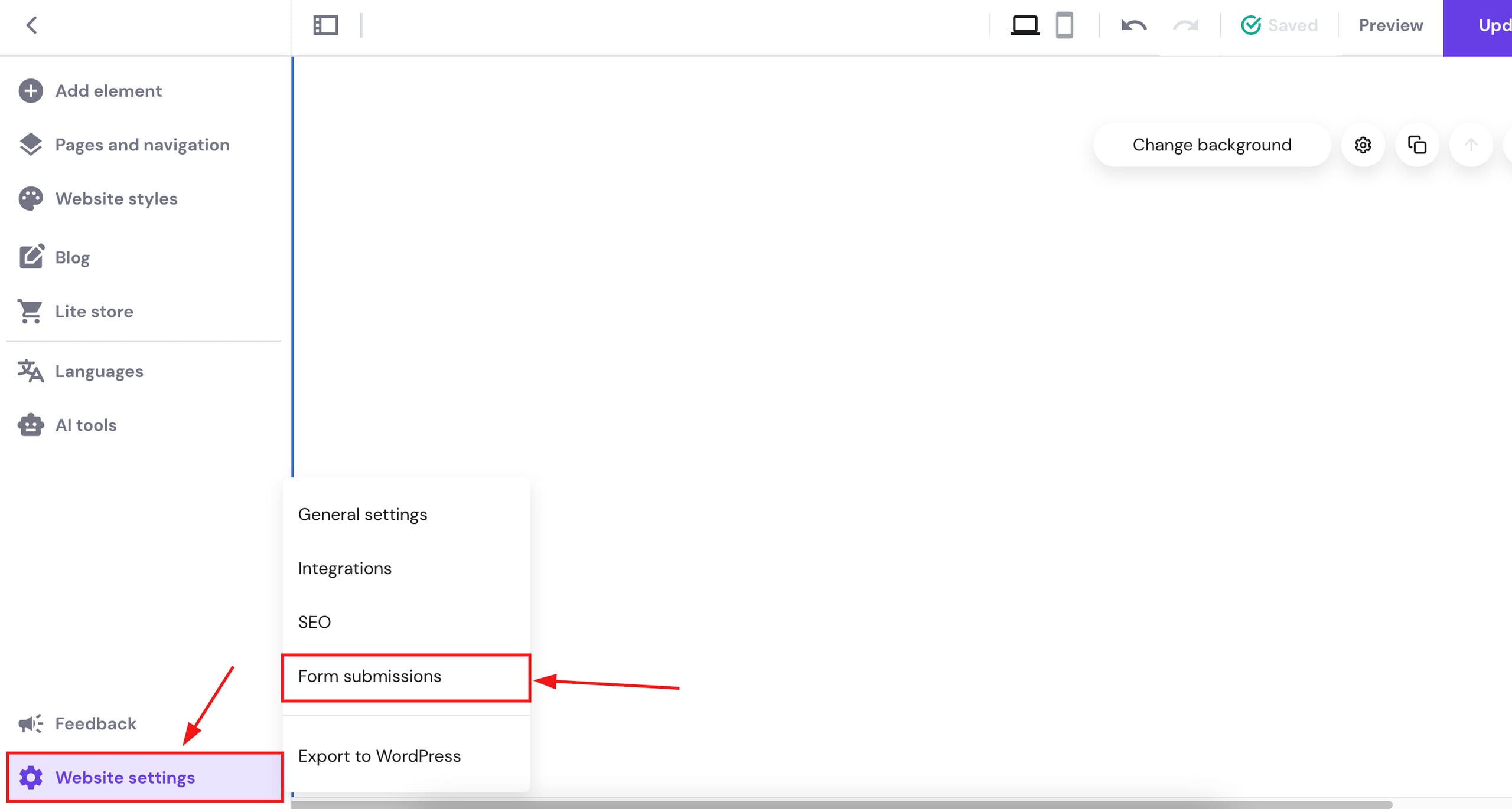Você pode visualizar todos os formulários que as pessoas enviaram por meio de seu formulário de contato no construtor. Expanda o painel de configurações do site à esquerda e vá para Envios de formulários:
