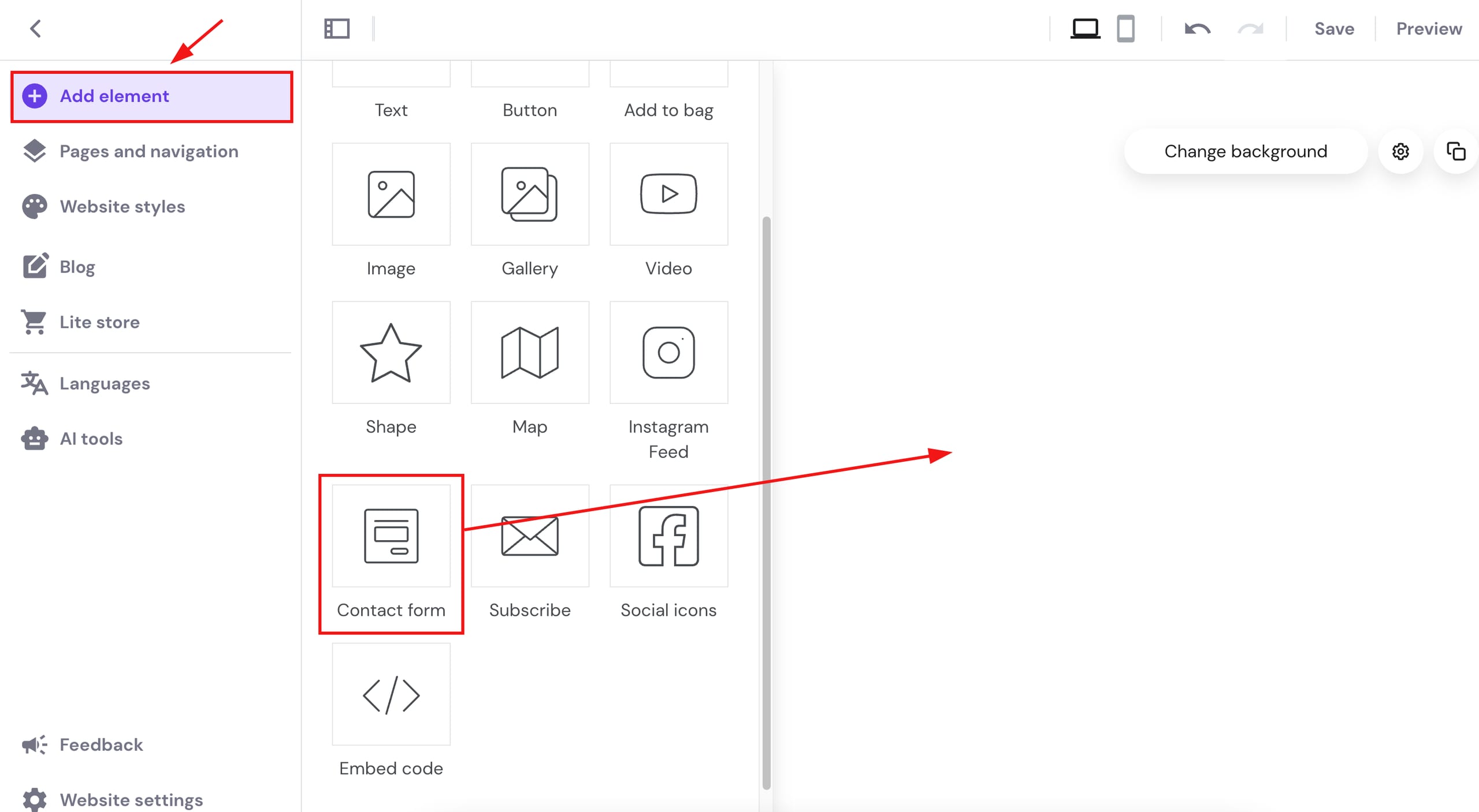 Para adicionar um elemento de formulário de contato, expanda o painel Adicionar elementos à esquerda. Encontre o elemento de formulário de contato e arraste e solte-o em qualquer lugar da sua página: