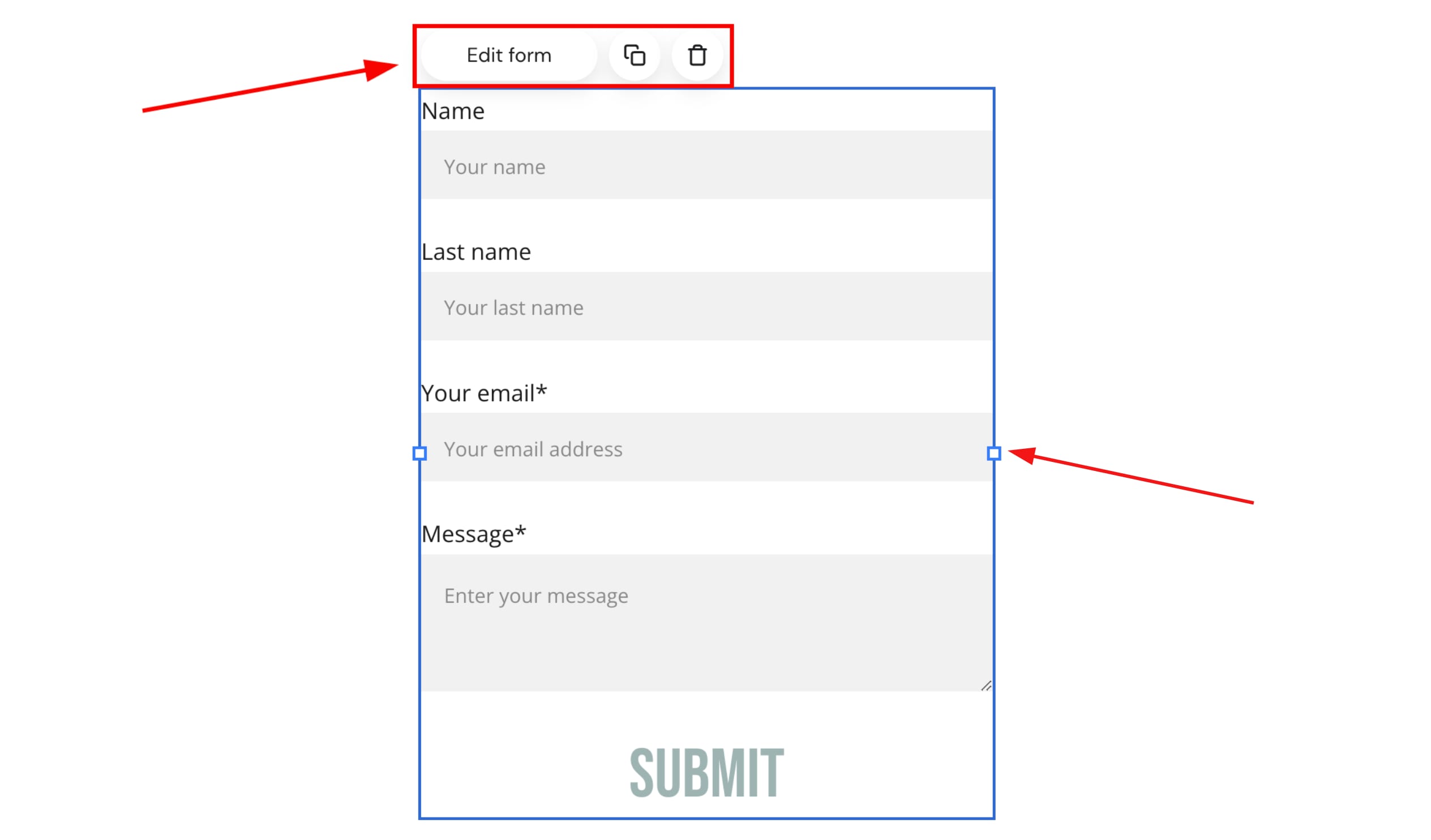 Clique no elemento do formulário de contato para ver mais opções (editar, duplicar, excluir, redimensionar):