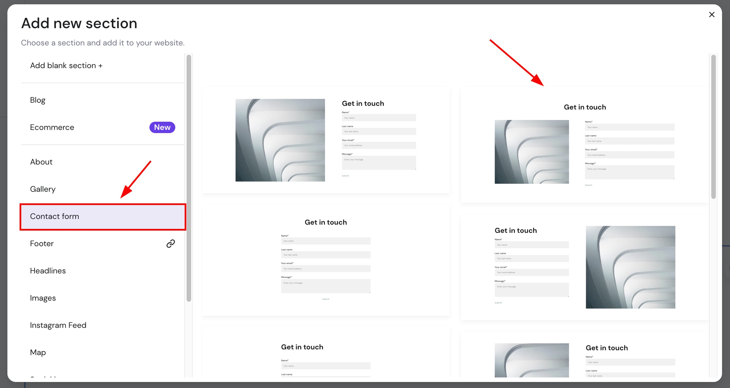 No menu à esquerda, escolha Formulário de contato. Selecione o modelo de seção preferido à direita e clique nele: