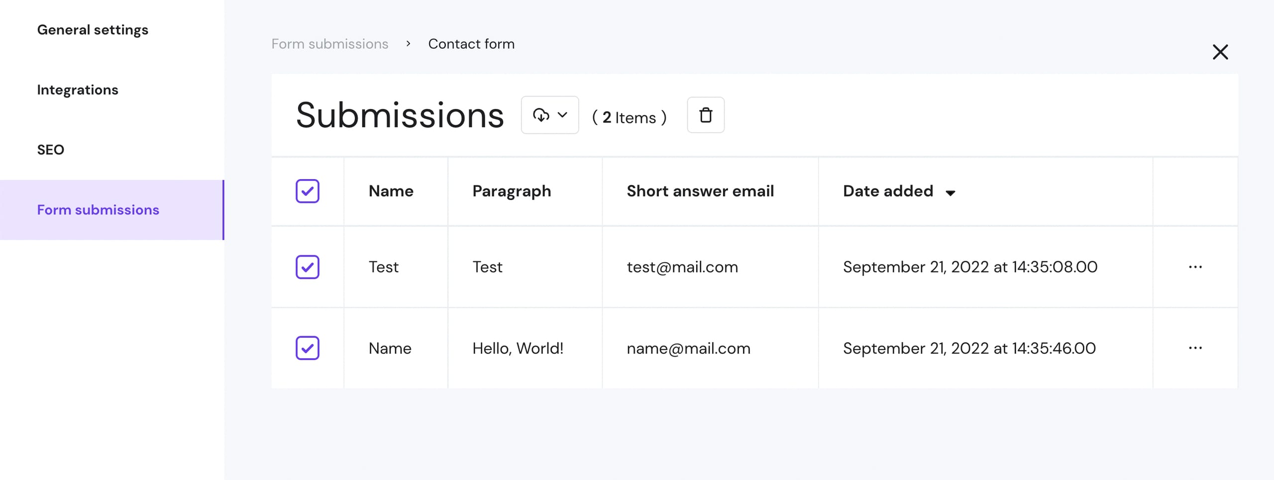 Clique em Exibir lista e você verá todos os formulários de contato enviados. Você pode exportar facilmente os formulários selecionados para um arquivo .CSV e excluir as respostas desnecessárias: