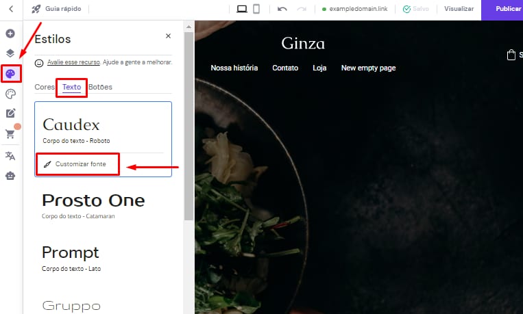 1. No editor de sites, clique no botão Estilos do site na barra de ferramentas que fica do lado esquerdo da tela. Depois, abra a aba Texto. Escolha uma combinação pronta de fontes ou crie uma combinação personalizada clicando no botão Customizar fonte.