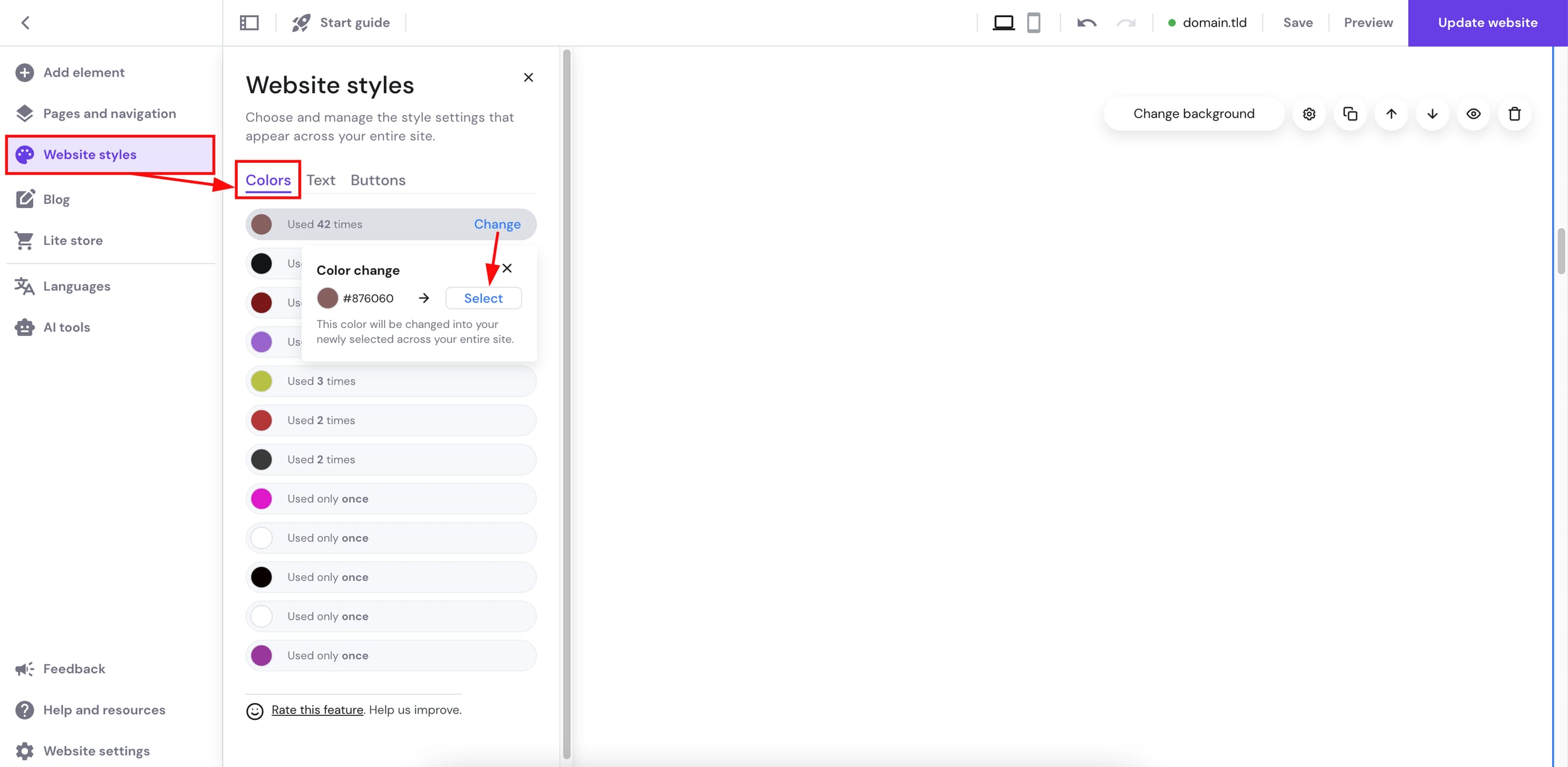 No editor, expanda o painel de Estilos à esquerda e abra a aba de Cores. Aqui, você encontrará todas as cores usadas em seu site. As cores usadas com mais frequência aparecem no topo da lista. Clique em Alterar ao lado de qualquer cor, selecione uma nova e ela substituirá a cor anterior em todo o site:
