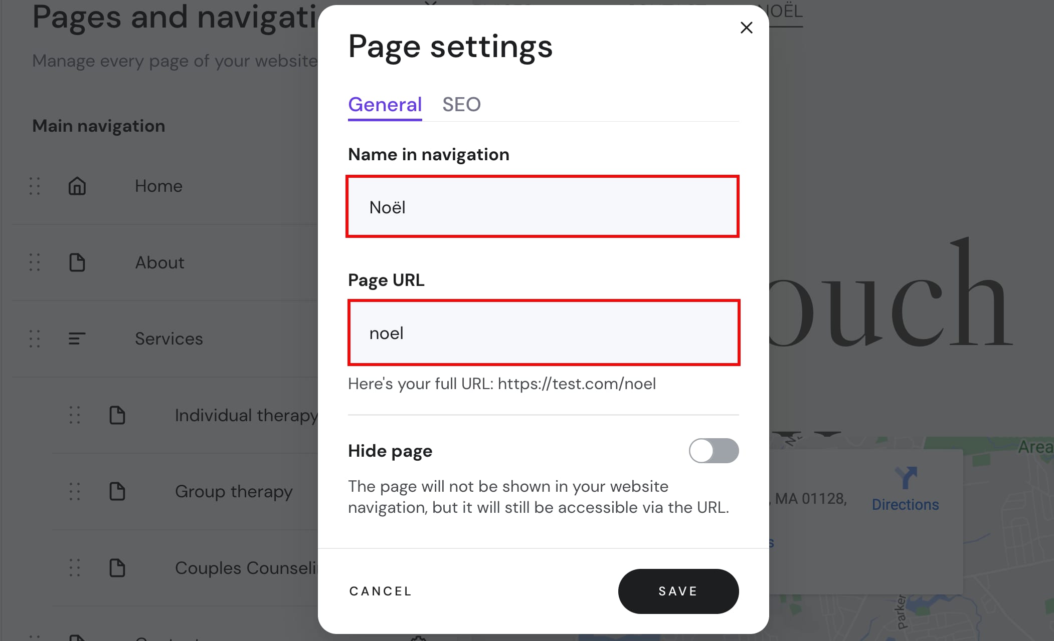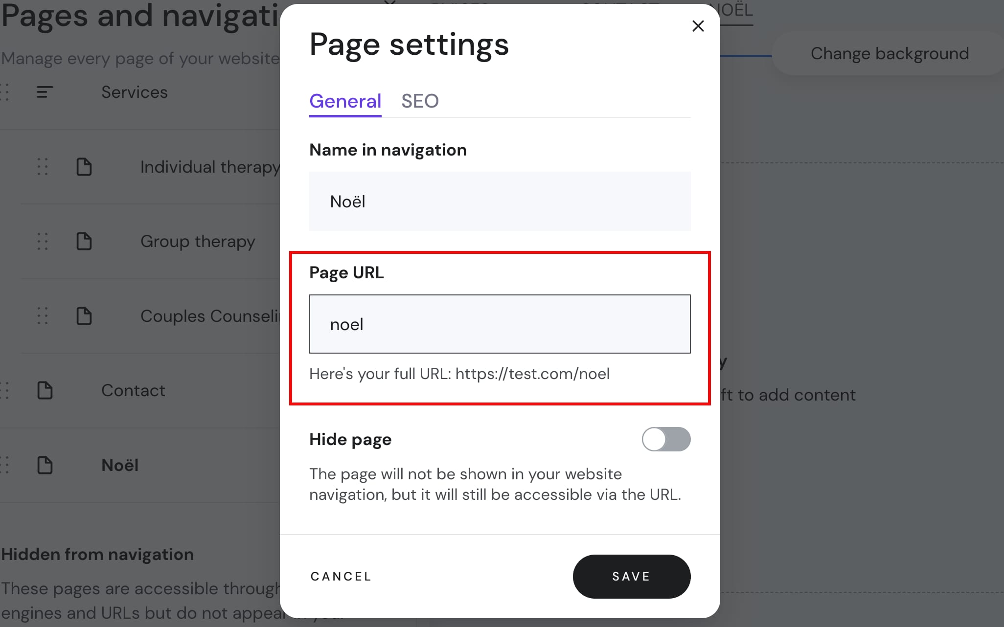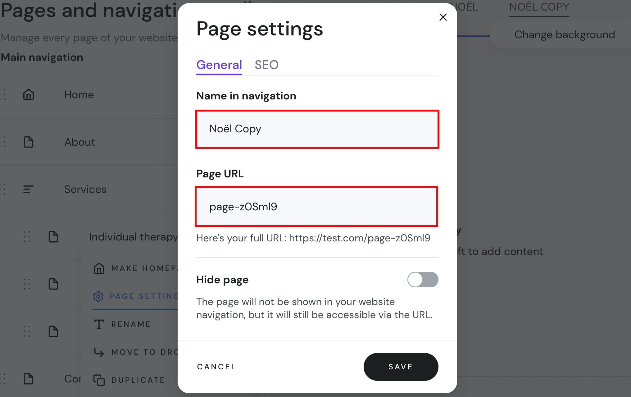 Você pode editar facilmente os URLs das páginas no construtor. Abra o painel Páginas e navegação à esquerda e abra as configurações de uma página específica: