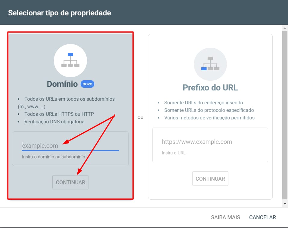 1. Entre na sua conta do Google Search Console. Digite seu domínio e clique em Continuar: