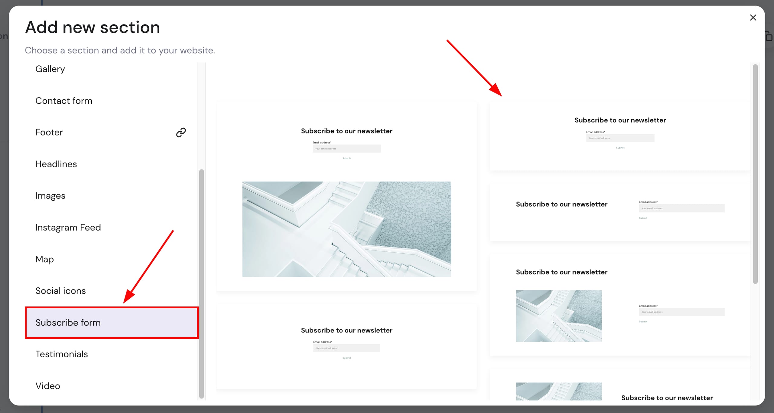 No menu à esquerda, escolha Formulário de inscrição. Selecione o modelo ou template de seção preferido à direita e clique nele:
