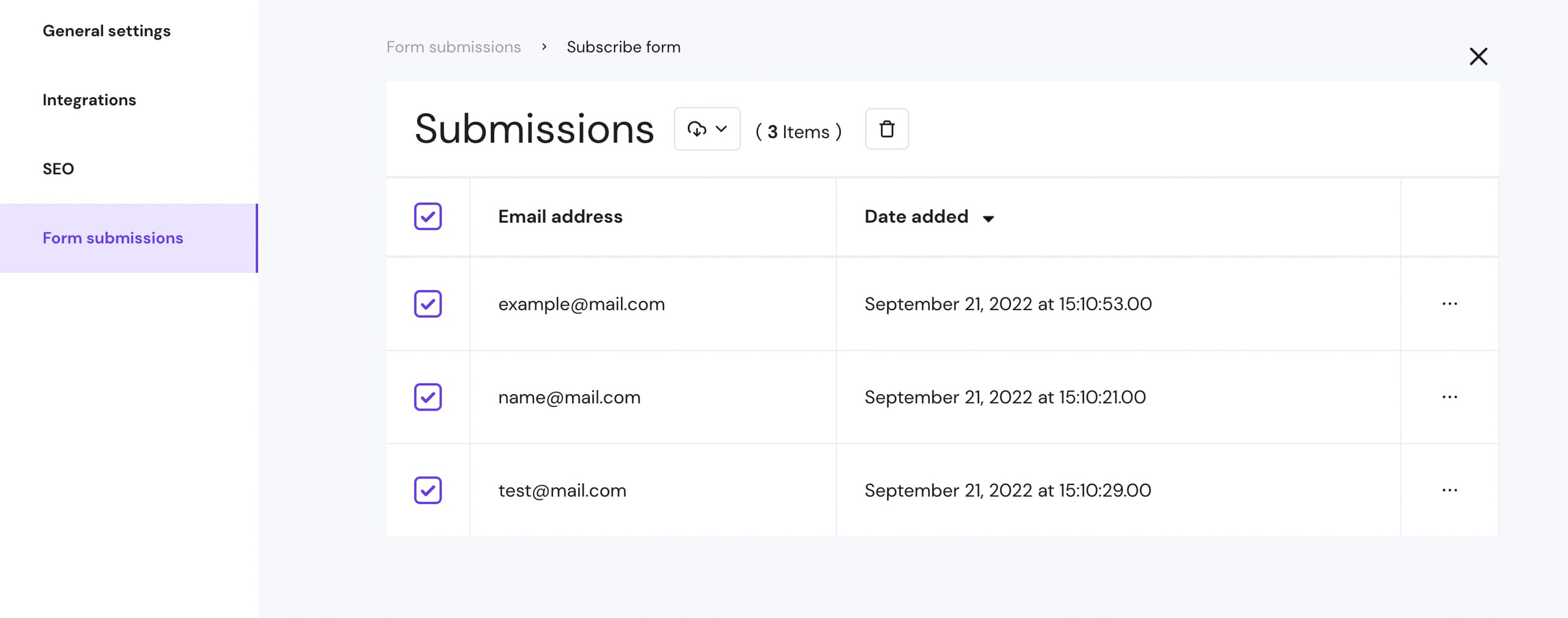 Você pode visualizar todos os formulários que as pessoas enviaram por meio de seu formulário de assinatura no construtor. Expanda o painel de configurações do site à esquerda e vá para Envios de formulários: