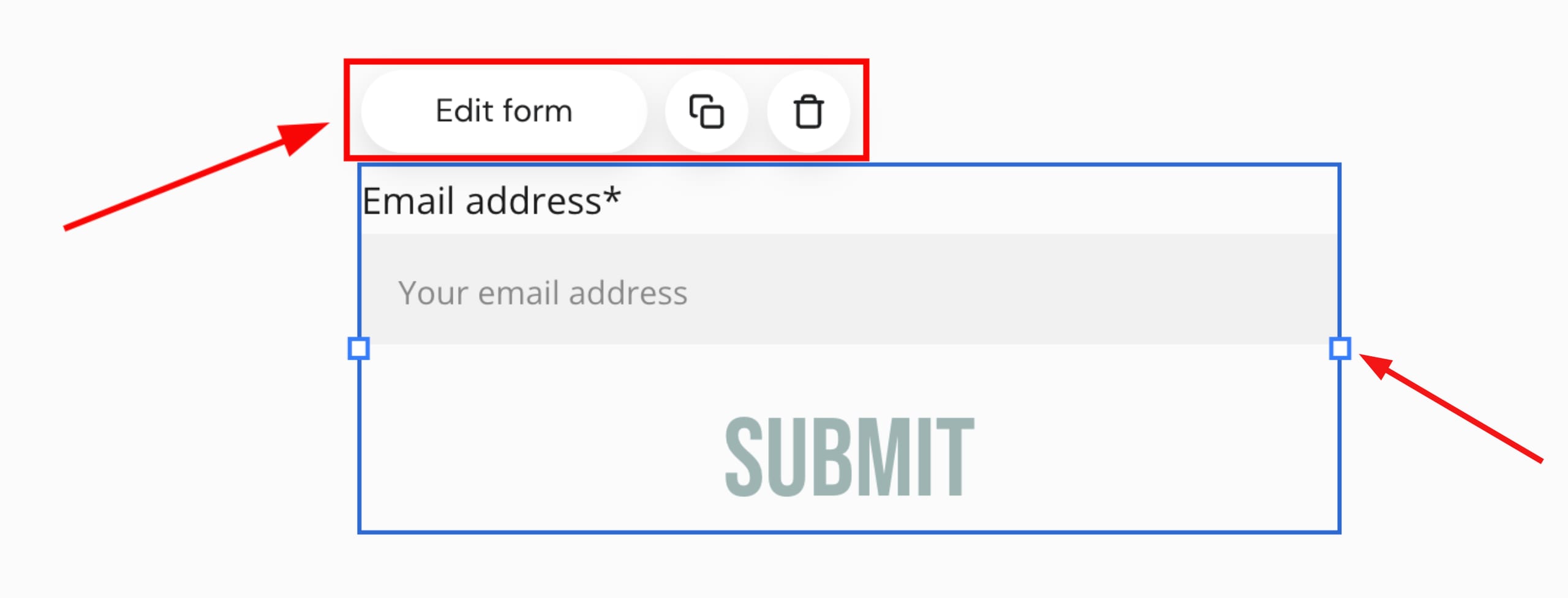 Clique no elemento do formulário de inscrição para ver mais opções (editar, duplicar, excluir, redimensionar):
