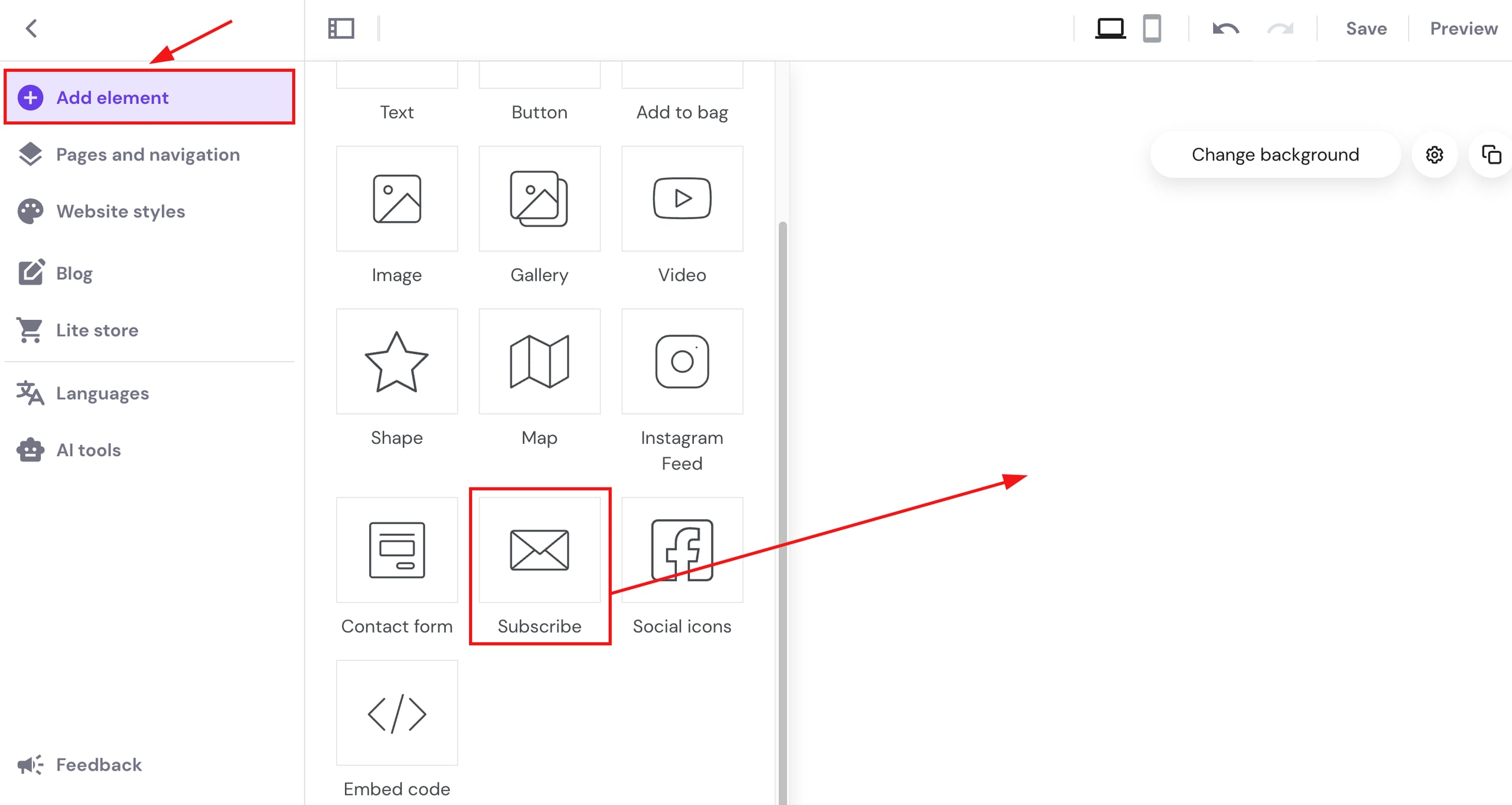 No editor, expanda o painel Adicionar elemento à esquerda. Encontre o elemento Assinar e arraste e solte-o em qualquer lugar da sua página: