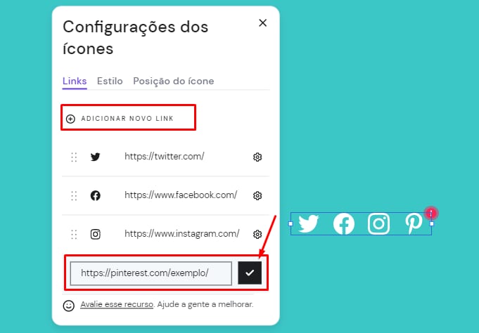 3. Selecione Adicionar novo link, digite a URL do seu perfil do Pinterest e clique no ícone de confirmação. O logo do Pinterest será adicionado automaticamente ao elemento: