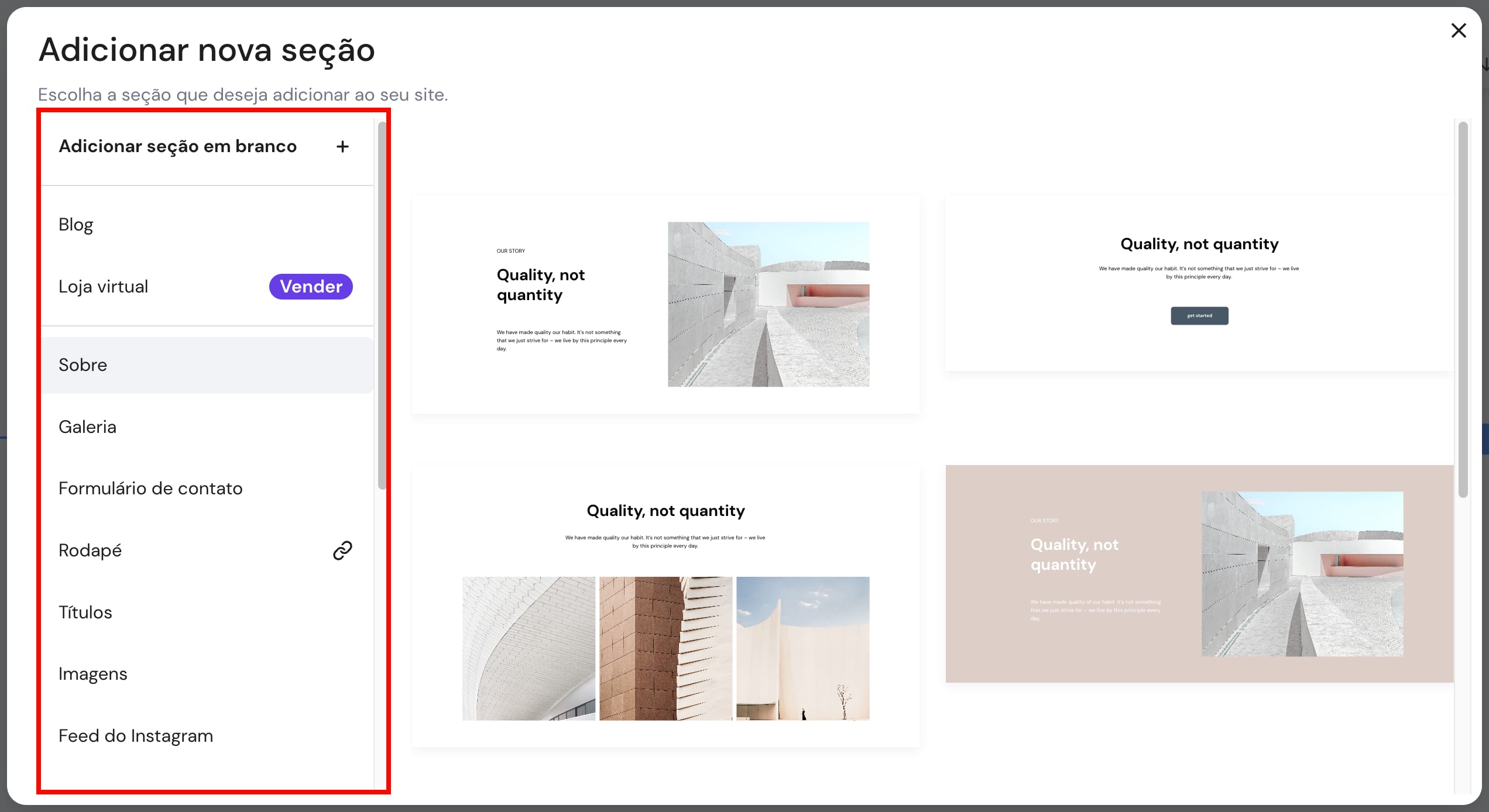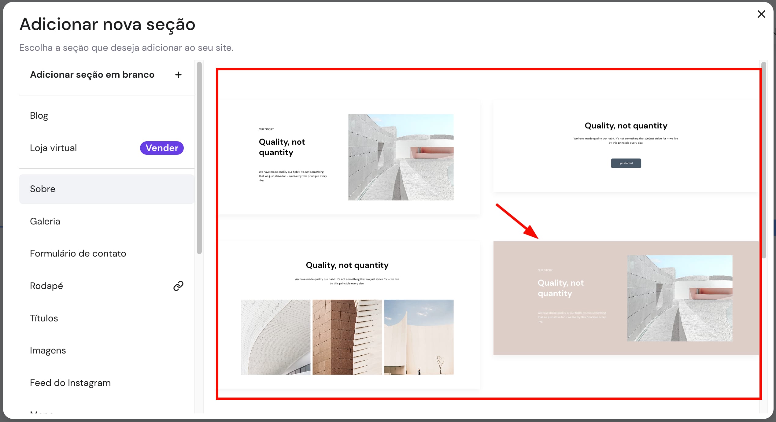 Se selecionar um tipo específico de secção, terá uma variedade de modelos de secção à escolha — basta clicar no modelo preferido e essa secção será inserida na sua página: