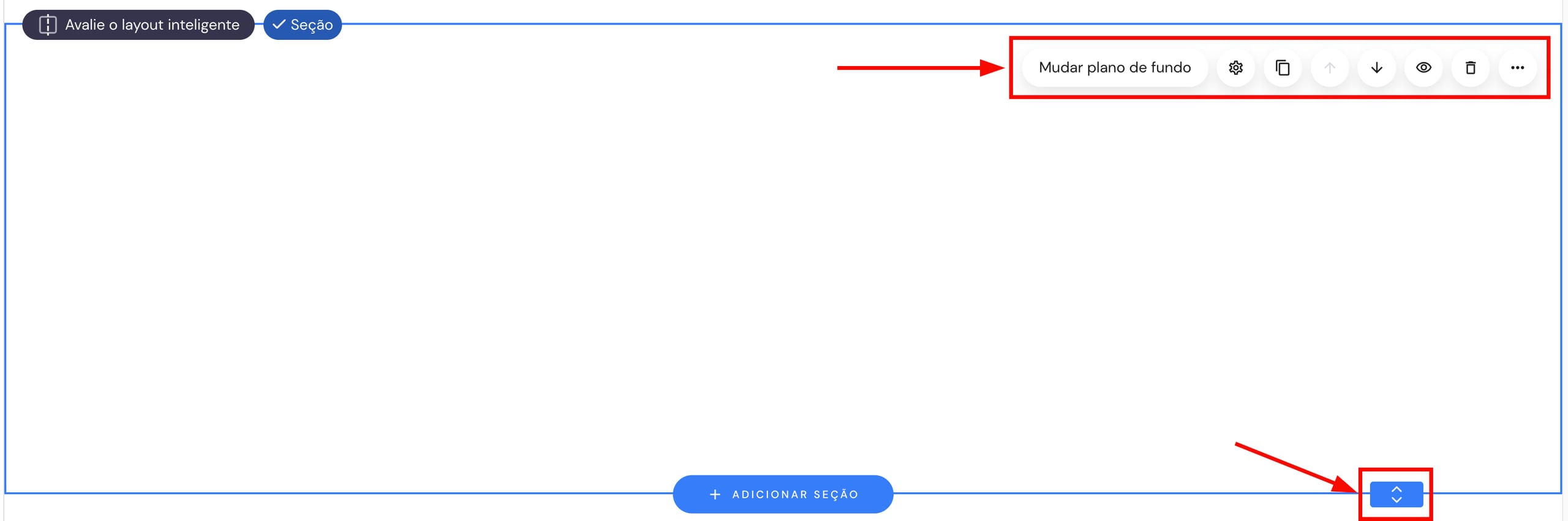 Para abrir as definições da secção, clique na secção em questão. Verá o menu de definições no canto superior direito de uma secção. Existe também uma alça de altura da secção no limite inferior da secção — arraste-a para cima ou para baixo para redimensionar a secção: