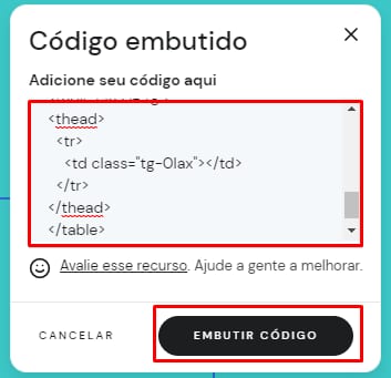 4. Entre no Criador de Sites da Hostinger e adicione um elemento de Código embutido. Cole o código que você copiou no Tables Generator e clique em Embutir código. A tabela vai aparecer no seu site.